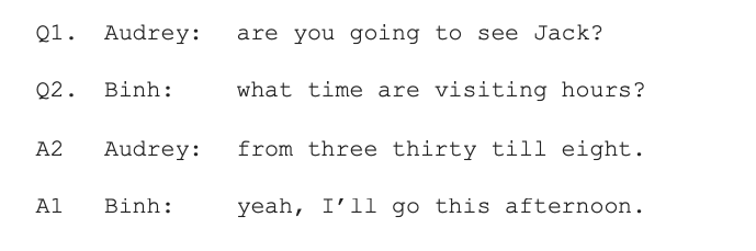 Our orientation to this norm of adjacency pairs is so strong, that we treat any next action as relevant in some way. Consider the following example from a telephone conversation between two women about visiting a mutual friend in hospital:
